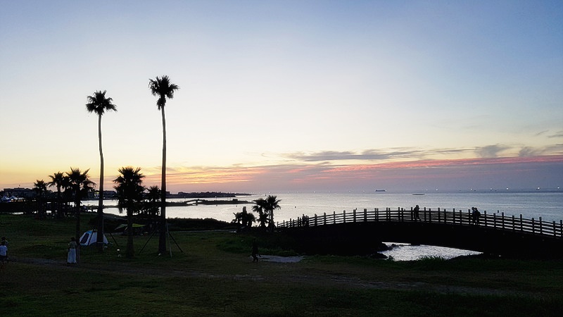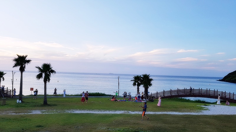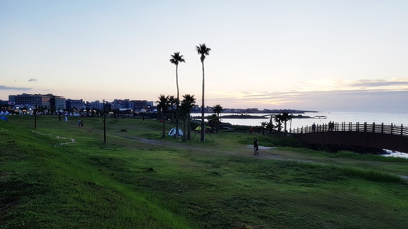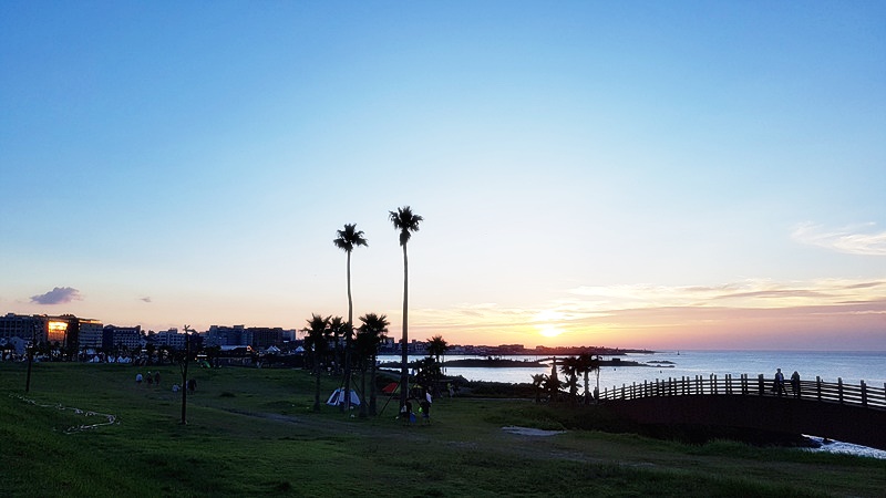 야자수 때문에 더욱 이국적인 정취를 물씬나게 만드는 함덕해변... 일몰이 시작될 무렵에는 이렇듯 많은 분들이 찾아오는 곳이기도 하지요.. 아마도 한낮 따가운 햇살을 뒤로하고 선선한 저녁시간을 즐기기 위함일 겁니다.