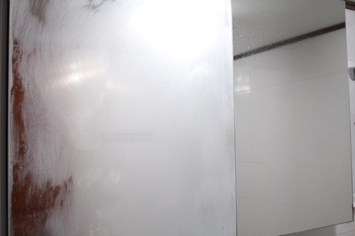 자외선 차단제로 닦은 왼쪽 거울과 닦지 않은 거울 비교 사진입니다. 이 모습만 조금 당황스럽죠..