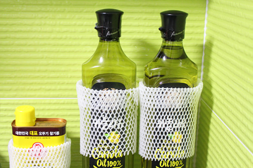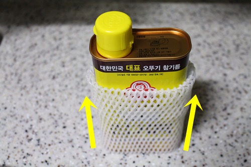 참기름이나 식용유를 사용할 때 입구 주변 기름이 주위로 흐르는 경우가 생겨 손에 묻는 경우가 많습니다. 물론 기름이 주방 곳곳 바닥에 묻히곤 합니다. 이때 과일 포장지를 씌워 보세요.