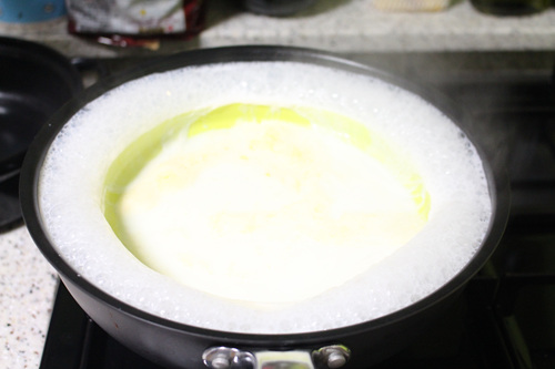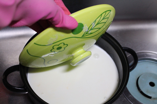 전 냄비에 우유를 옮겨 담은 뒤 뚜껑에 우유가 닿이도록 뒤집어 뒀어요. 이 상태로 완전히 식을 때까지 두어야 합니다. 전 밤새 두고 아침에 확인해 보기로 했습니다.