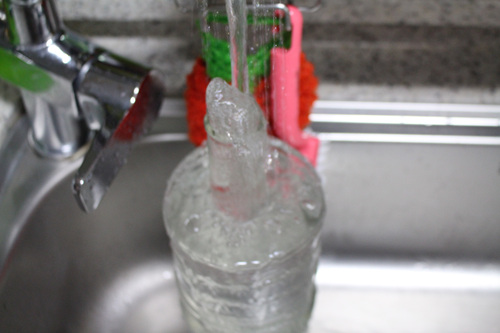 밤새 잘 불려진 유리병을 부드러운 수세미로 닦으면 됩니다.