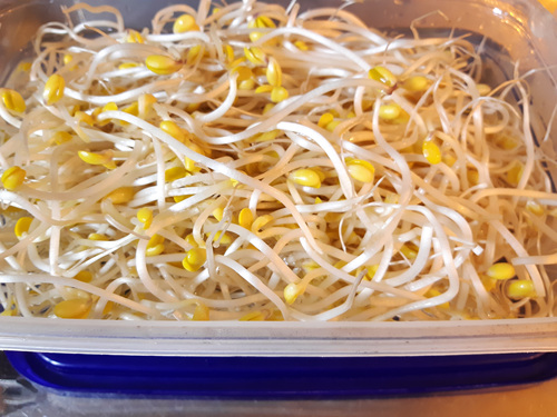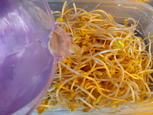 그리고 밀폐용기를 준비한 후 통에 씻어 놓은 콩나물을 담으세요.