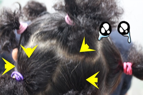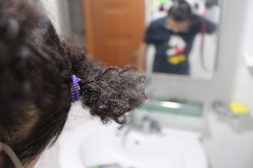 머리카락을 7~ 9 분할하여 고무줄로 머리를 묶어 줍니다. 전 머리숱이 별로 없어서 7분할 정도 했네요. 만약 머리가 길다면 머리를 묶을때 돌돌 말아서 묶어 주세요. 그래야 염색할때 편해요.