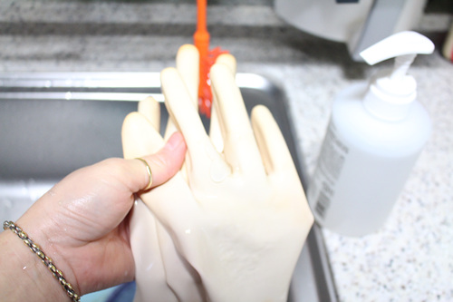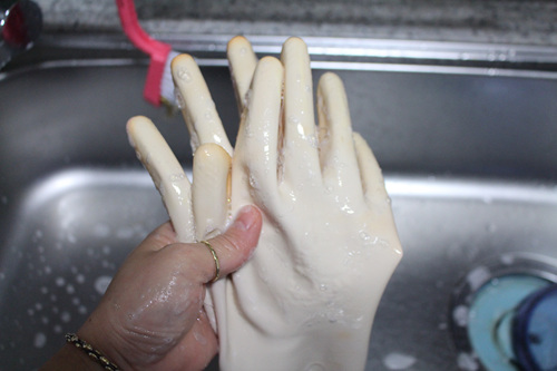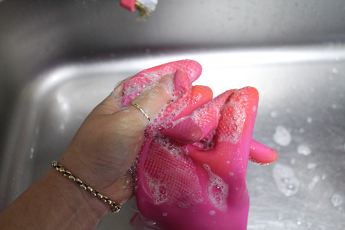 하여간 고무장갑 겉을 씻었으면 이젠 뒤집어서 고무장갑 속도 같은 방법으로 씻어요. 사실 속이 더 중요한 부분이니....