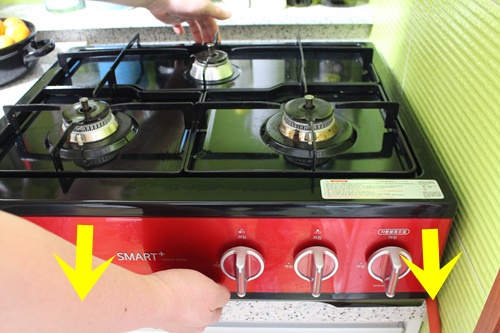 평소에 자세히 보지 않고 사용하고 있었는데 남편이 알려준 대로 자세히 보니 가스렌지 왼쪽 아래에 빨간 불이 가스렌지를 점화할때마다 깜빡거리고 있더군요.