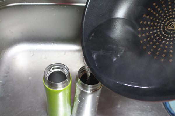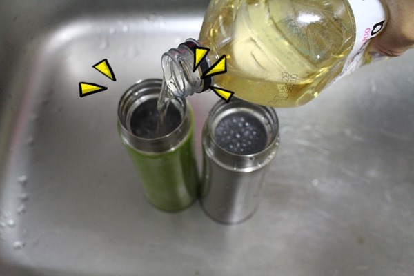 베이킹소다가 든 텀블러에 팔팔 끓인 물을 넣습니다.