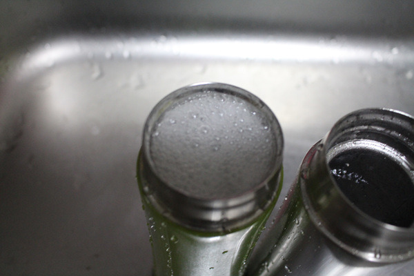 이렇게 베이킹소다. 뜨거운 물, 식초 섞은 것을 약 1분 정도 둔 뒤.......병 씻는 솔을 이용해 한 번 닦아 주세요.