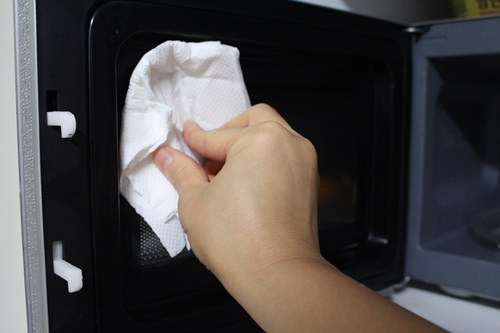 2분 돌리 후엔 전자렌지 내부를 키친타올로 닦아 주세요. 힘들이지 않고도 쉽게 청소가 가능합니다.