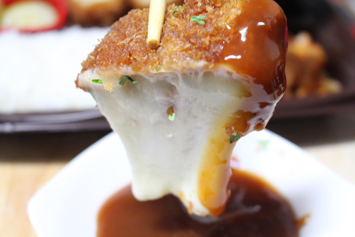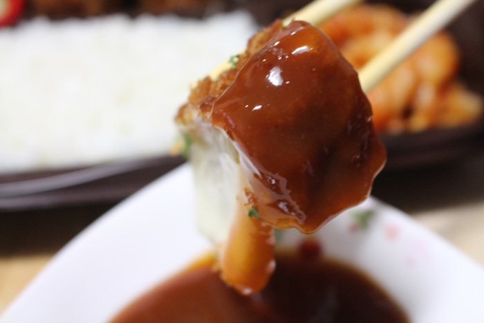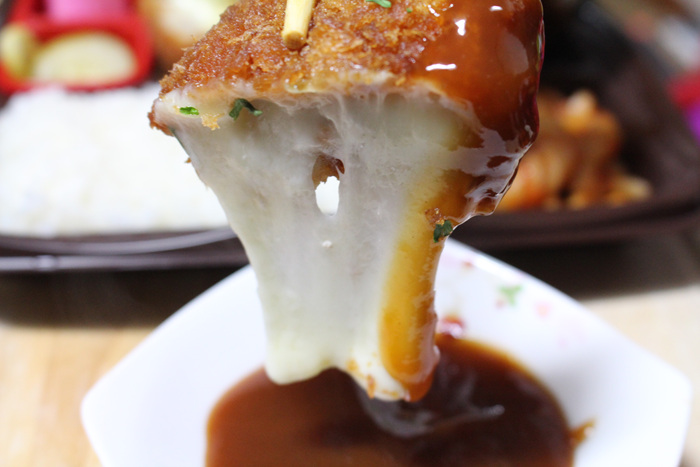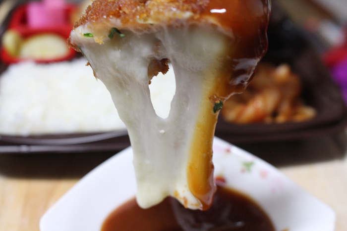 돈까스 소스에 찍어 먹으려고 하는데 치즈가 계속 쭈~~~욱 늘어 납니다.