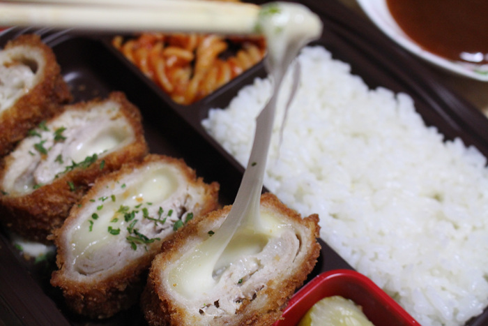 치즈돈까스가 4조각이지만 커서 한 입에 다 들어가지 않습니다.