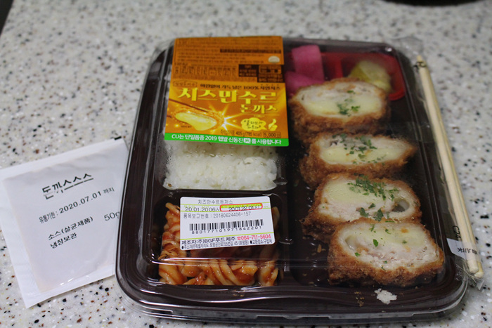 전 돈까스를 고르고 남편은 수육 도시락을 골랐습니다. 참 세상 좋아졌다는 말이 절로 나오게 요즘에는 별게 다 편의점 도시락으로 나오는 것 같습니다.
