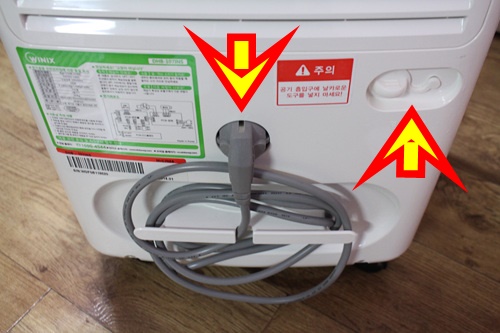 제습기 뒷면의 이 구멍은 바로 연속해서 물이 나올 수 있도록 한 배출구입니다. 제습기를 몇 시간만 틀어도 물통에 물이 가득 차는 집이라면 뒷면 구멍에 호수를 연결해서 사용하면 물통을 교체하지 않고도 제습기가 자동으로 계속 작동이 됩니다. 보통은 물통에 물이 가득차면 제습기 작동을 멈추거든요.