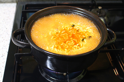 라면이 팔팔 끓으면 면을 공기와 접촉시켜 주면 면발이 쫄깃해집니다.