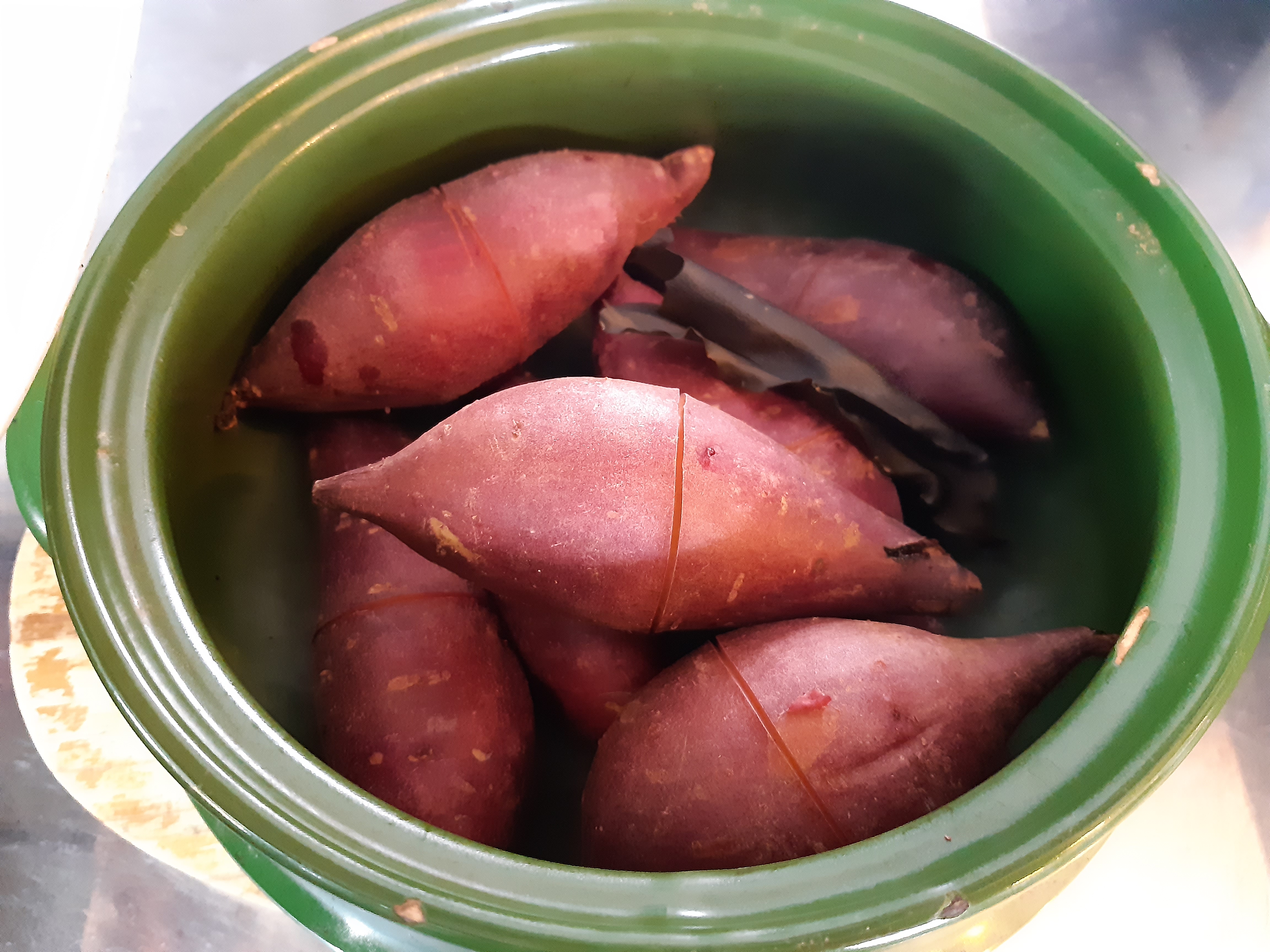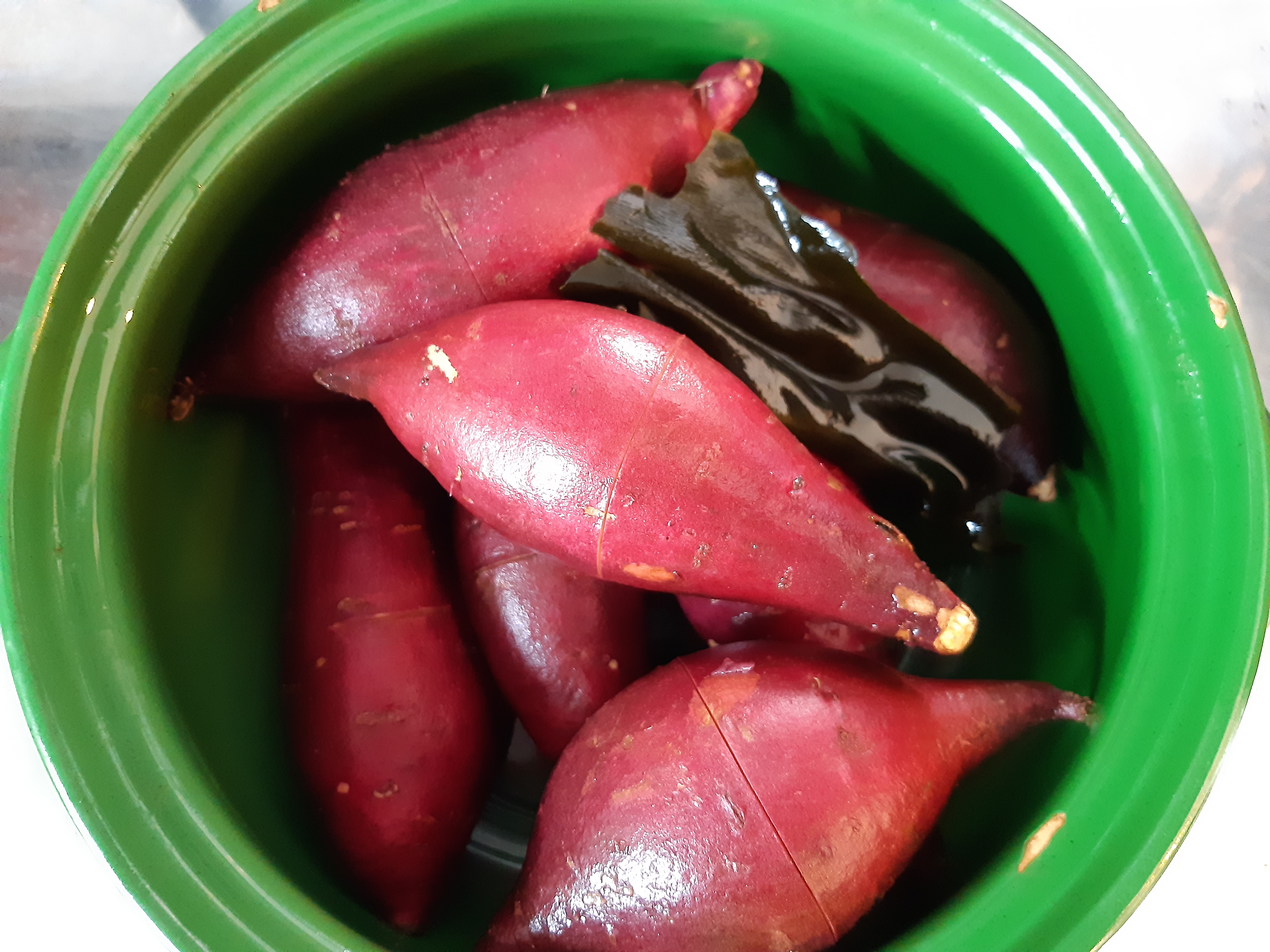 그리고 마른 다시마를 물에 적셔 넣어 주세요. 다시마를 넣고 군고구마를 하면 다시마의 염분이 끓는 점을 높여 주어 고구마를 빨리 익게 합니다.