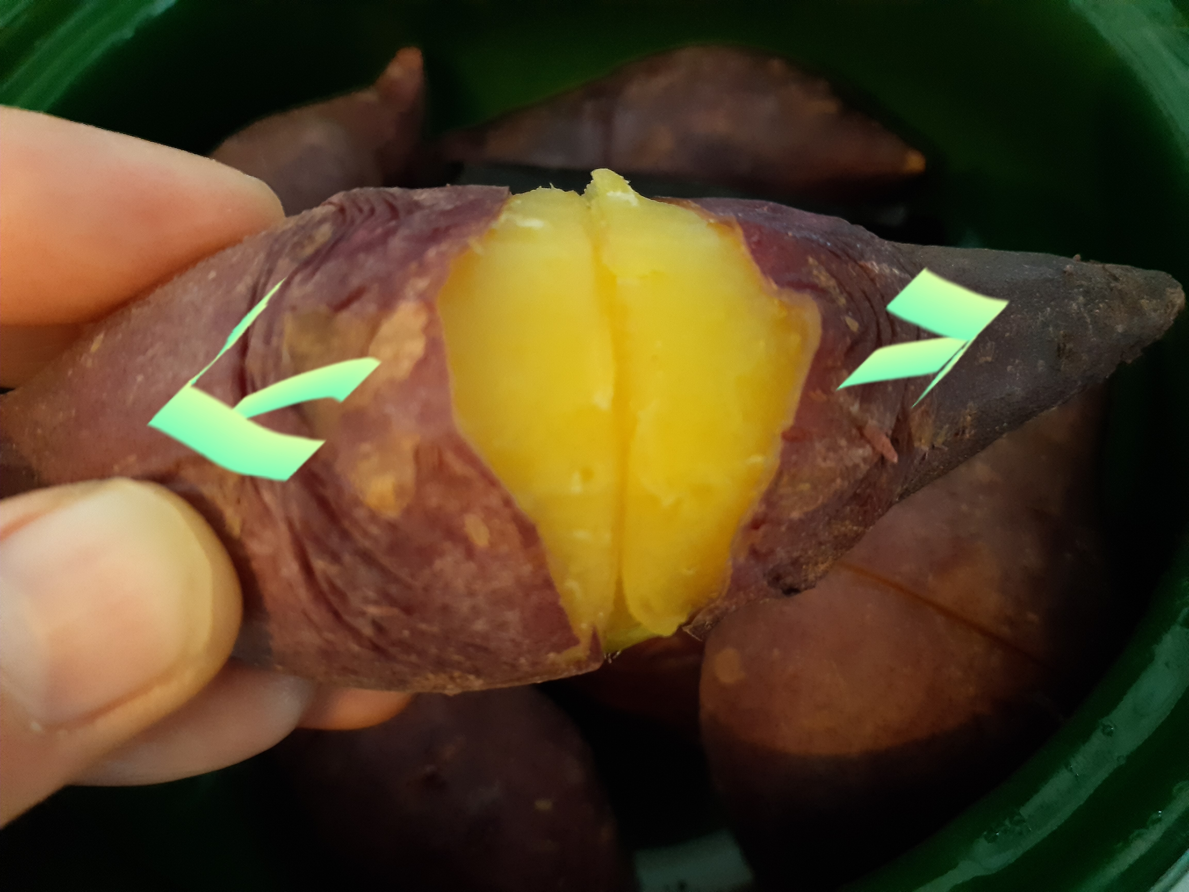 고구마껍질은 양쪽으로 껍질을 밀면 쉽게 벗겨집니다. 고구마는 뜨거울때 먹어야 제맛이죠. 껍질이 잘 벗겨져 뜨거울때 먹어도 문제없어요.