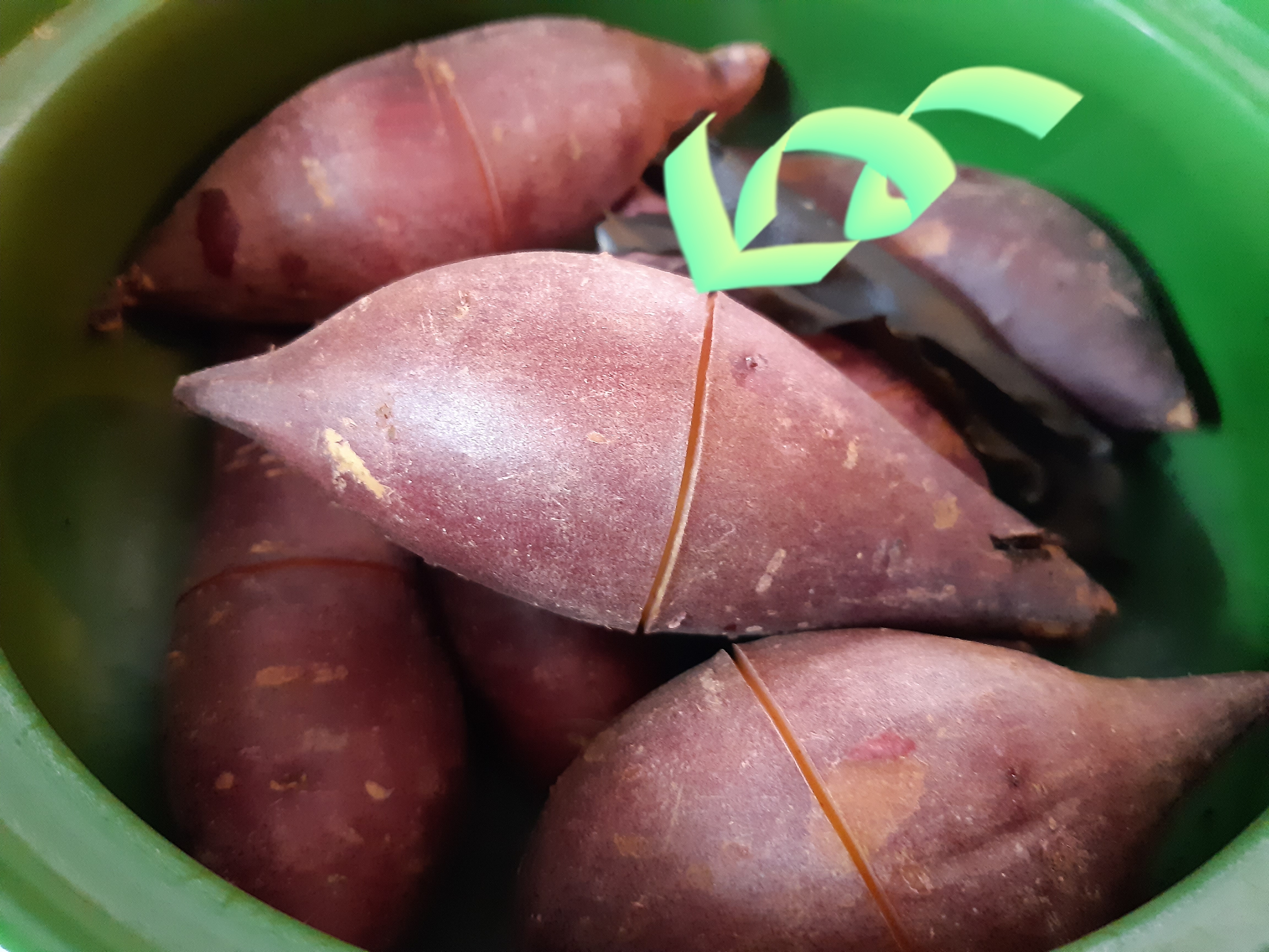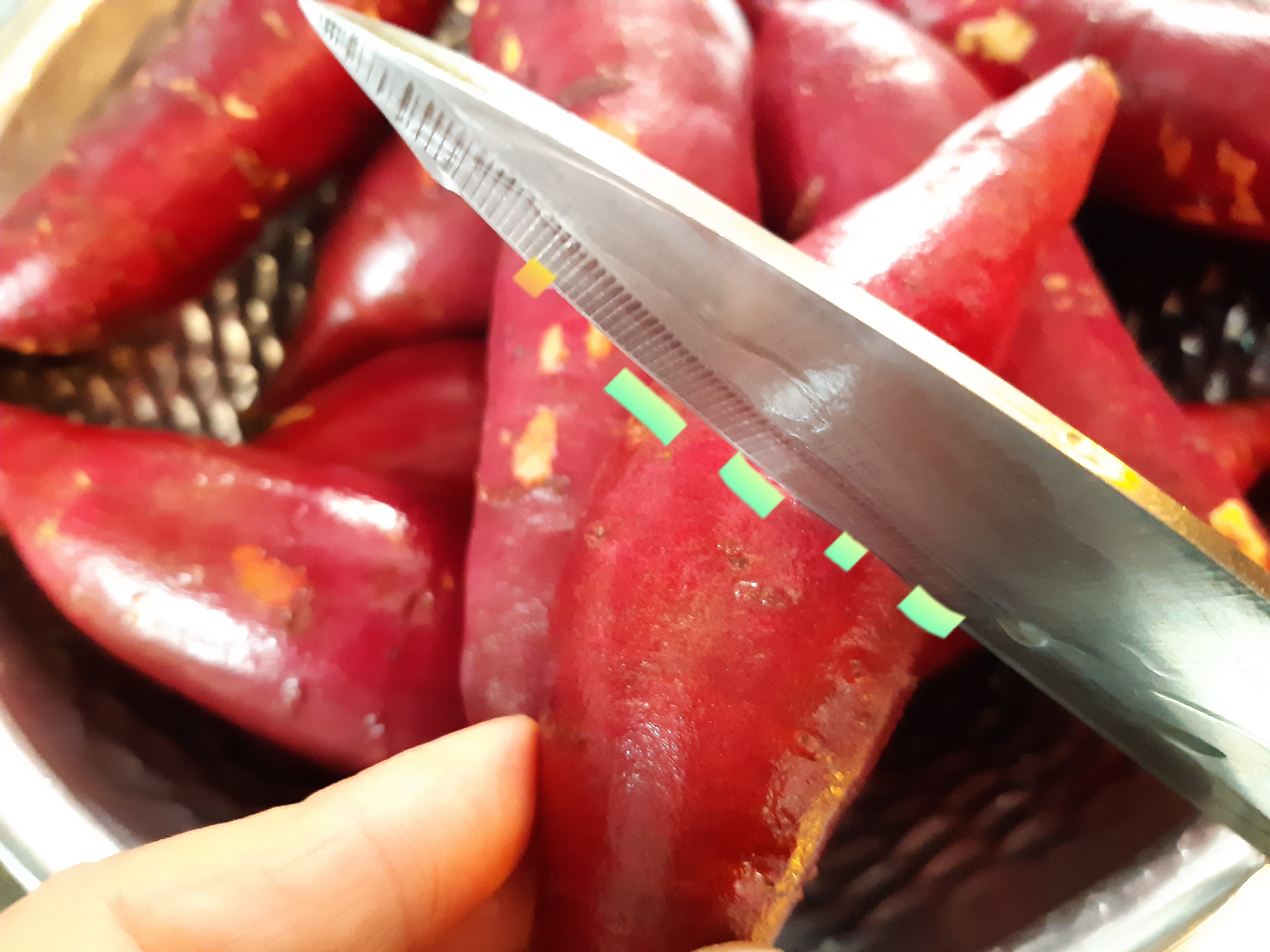 고구마 중간에 칼집을 내어 줍니다. 칼집을 내어 주는 이유는 고구마가 익었을때 껍질을 쉽게 벗기기 위해서 입니다.