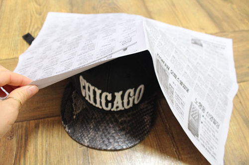 모자위에 신문지를 덮은 뒤 헤어드라이기를 골고루 쐬어 주세요. 이렇게 해 주면 모자에 밴 고기냄새가 신문지로 흡착이 되어 냄새가 나지 않습니다. 신문지를 덮고 약 1분 정도 헤어드라이기로 냄새를 날린 후 모자 냄새를 맡아 보니 마치 드라이크리닝 한 것 같은 냄새가 솔솔~
