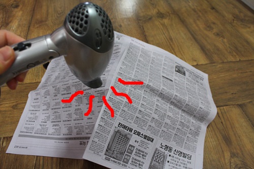 쓰레기봉투에 넣어 헤어드라이기 바람을 쐴때는 1단으로..