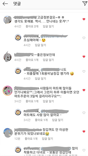 마트에서 장갑을 착용하고 장보는 모습을 SNS에 올리니 댓글 대부분이 호응하는 분위기입니다. 아는 동생은 '고급정보' 라는 표현까지....거기다 '장갑을 껴도 안 이상한 분위기가 되었나보다 ' 라는 글에 조금은 저도 씁쓸해지긴 했습니다. 지금은 뭐니뭐니 해도 개인위생이 중요한 시기이니 모두 자신의 위생관리는 조금 유별나다고 생각이 들어도 하는게 맞는 것 같습니다. ^^;;