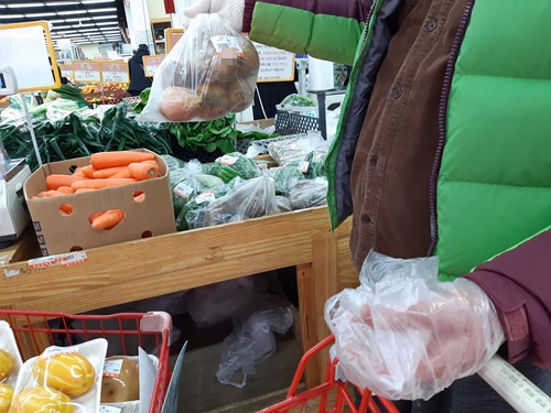 그렇게 장을 보는 사람들 모습에 남편은 1회용 비닐봉지를 장갑을 착용하지 않은 다른 손에 끼운 채 장을 봤습니다. 처음엔 유난스럽다라는 생각이 들었지만 마트안에서 본 사람들의 모습에 절대 유난스럽지 않은 그런 모습이 자연스럽게 되었습니다.