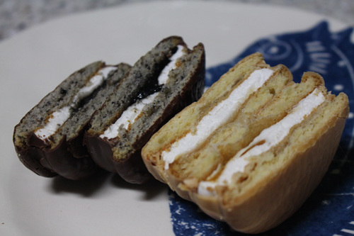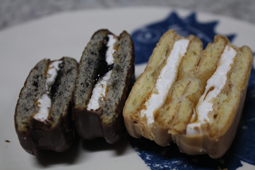 크기는 일반 초코파이와 약간 차이가 있어요. 왼쪽이 흑임자 초코파이구요. 오른쪽이 인절미 초코파이입니다.