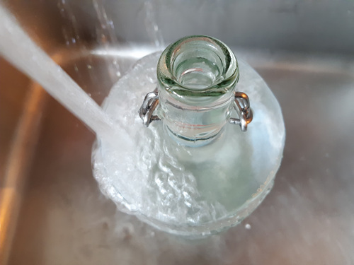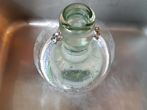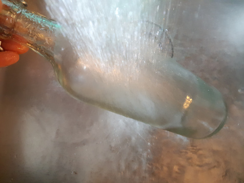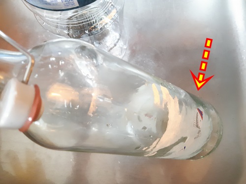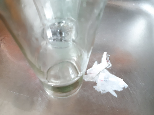 페트병 안에 있는 병에 붙은 스티커가 물에 잘 불려졌다면 유리병을 꺼내 스티커를 제거해 주세요.