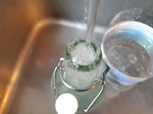 물을 부운 페트병에 주방세제를 한 방울 넣은 뒤 페트병에 물을 채워 주세요.