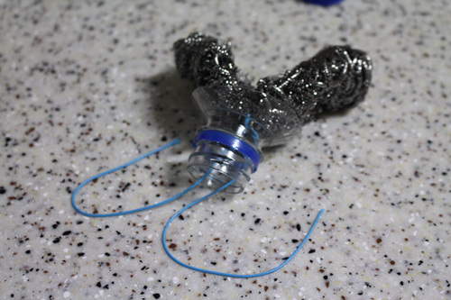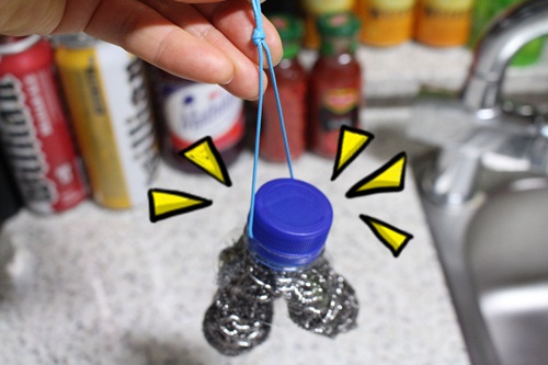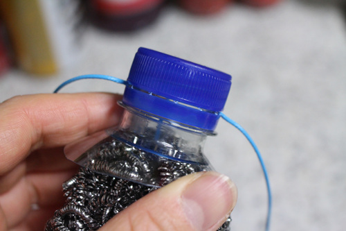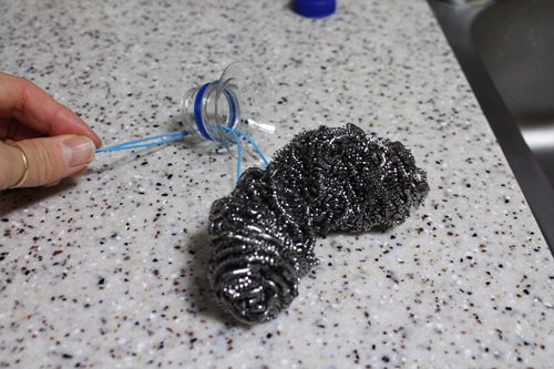 철수세미가 연결된 끈을 페트병 속으로 넣어 주세요.