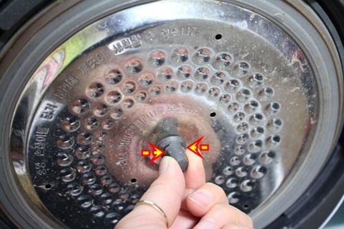 밥솥을 뒤집어 보시면 철사 같은 것이 보이는데요. 이것은 압력추가 막혔을때 뚫어주는 것입니다.