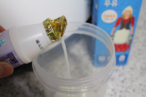 발효용기에 우유 900ml 넣습니다. 참고로 우유는 일반 흰우유입니다.