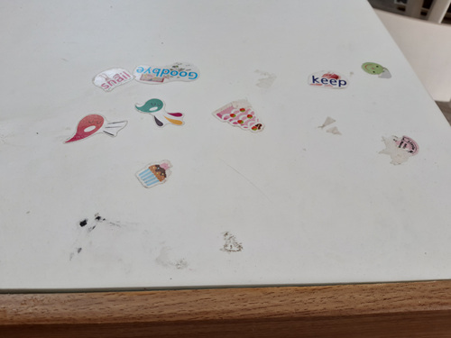 스티커가 덕지덕지 붙어 더 더럽게 느껴집니다. 거기다 오래되어 잘 떨어지지 않지요.