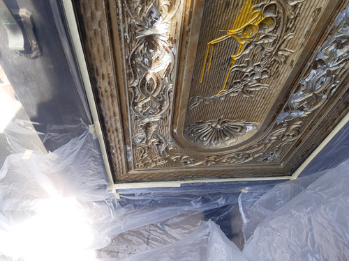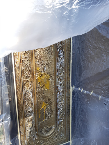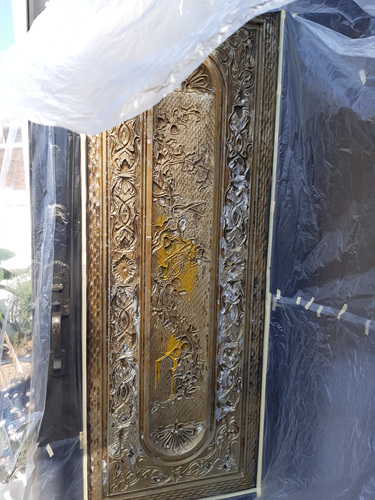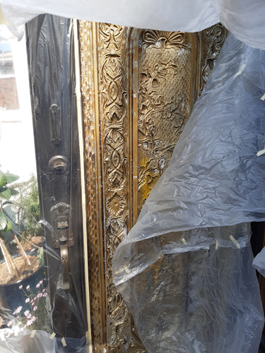 비닐을 대문에 씌우기 시작했습니다. 잘 뜯어지게 비닐을 붙일때는 종이테이프를 붙이는 센스까지..