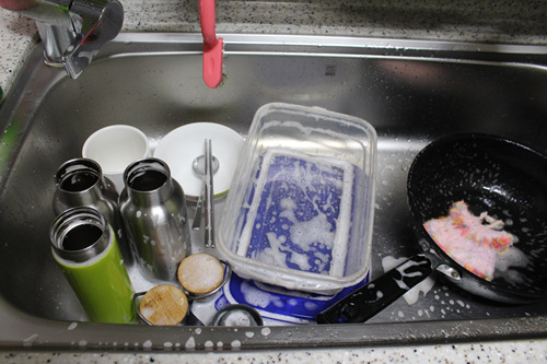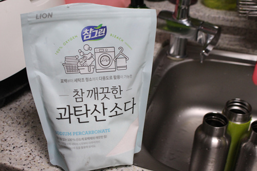 과탄산소다를 넣고 뜨거운 물을 부은 뒤 따로 수세미 같은 것으로 또 박박 씻을 필요는 없어요.