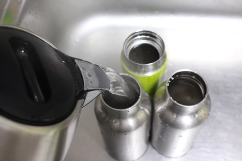 과탄산소다를 넣었다면 뜨거운 물을 부어 주면 간단히 물때가 지워집니다.