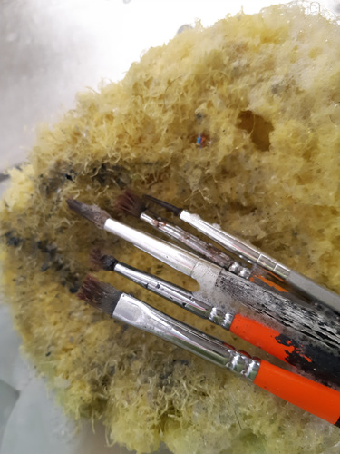 전 날 씻어 두고 갔던 붓들이 아침이 되니 뽀송뽀송 새 붓처럼 다 말랐어요. 물론 뻣뻣함은 사라진 상태.... 하루 사용하고 뻣뻣해졌다고 그냥 버렸던 분들 계실거예요. 이제 유성페인트가 묻어 붓이 뻣뻣해졌다면 주방세제로 씻어 보세요. 정말 놀라운 일이 벌어질겁니다. ^^