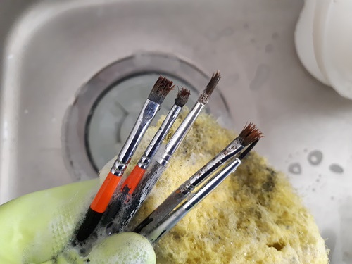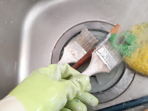 수세미에 주방세제를 묻혀 거품을 잔뜩내어 유성페인트가 묻은 붓을 닦으면 붓에 묻은 페인트로 인한 뻣뻣함과 유성페인트가 잘 지워집니다.