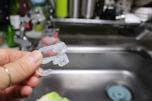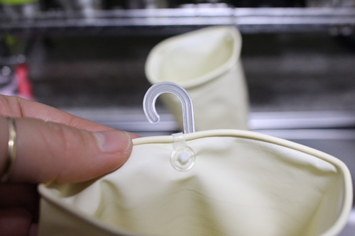 이렇게 고리를 붙여 놓은 뒤 싱크대 선반에 걸어 두니 물기도 자연스럽게 쫙쫙 잘 빠지고 고무장갑 안에도 바람이 숭숭~~ 환기도 잘되어 1석 2조의 효과까지 됩니다.