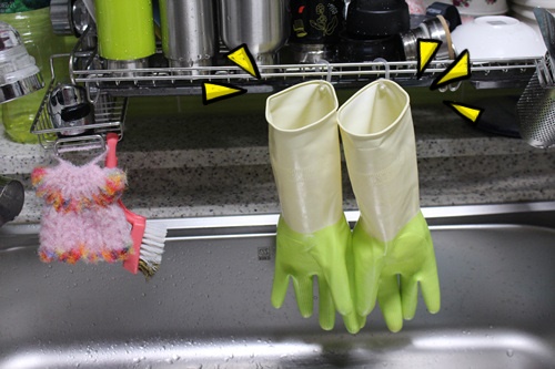 이렇게 고리를 붙여 놓은 뒤 싱크대 선반에 걸어 두니 물기도 자연스럽게 쫙쫙 잘 빠지고 고무장갑 안에도 바람이 숭숭~~ 환기도 잘되어 1석 2조의 효과까지 됩니다.