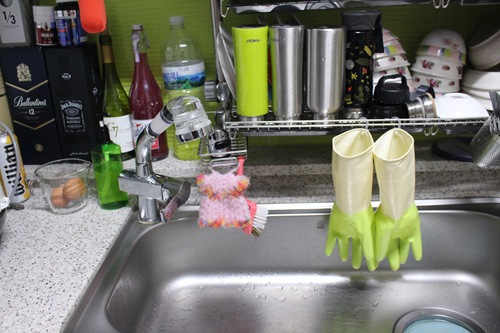 이렇게 걸어 놓으니 위생적이기도 하고 무엇보다도 물기가 싱크대 개수대 안에서 다 흘러 내려 좋습니다. 그 전엔 싱크대에 걸쳐 놓으면 바닥에 물이 흥건했던 적도 있었거든요. 이젠 물기도 위생적으로 잘 제거되고 고무장갑 안도 뽀송뽀송 잘 말려지니 너무 좋네요. 남편도 이 모습을 보더니 한 마디 합니다.