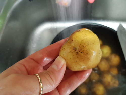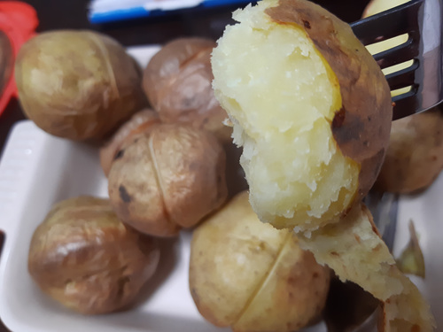 포크를 꽂아서 감자껍질을 벗기면 다 먹는 내내 뜨거워서 껍질 못 벗기는 일은 없어요. 물론 먹기도 너무 수월해서 좋아요.