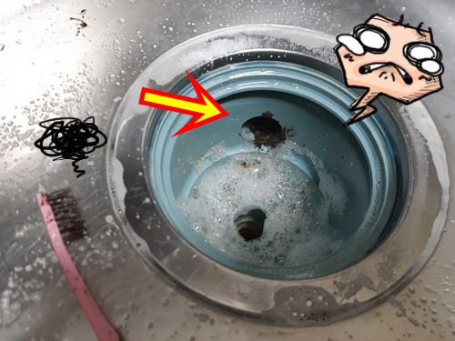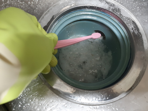과탄산소다와 뜨거운 물이 만나 찌든때를 분해하고 있으니 억지로 수세미를 넣어 닦을 필요는 없습니다. 하지만 개수대 옆 부분 작은 구멍을 자세히 보고 경악! 시꺼먼 물때가 잔뜩 끼어 있더군요.