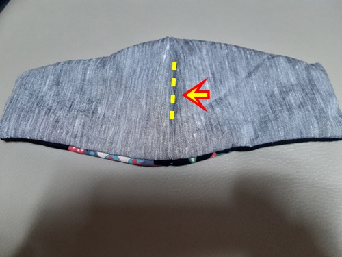 마스크 겉면과 마스크 안감부분을 같이 뒤집어서 박음질 해주면 마스크 모양 끝....참고로 고무줄이 들어갈 부분을 2cm 남겨 두고 박음질 해야 합니다.
