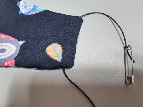 끈을 끼우고 나니 완벽한 마스크의 형태가 되었습니다. 요건 남편꺼....... ㅋㅋ... 콧수염이 있는 원단으로 해 줄려고 했더니 부엉이 원단이 낫다고....하여간 원하는 디자인을 해줘야 잘 착용하고 다니겠죠~