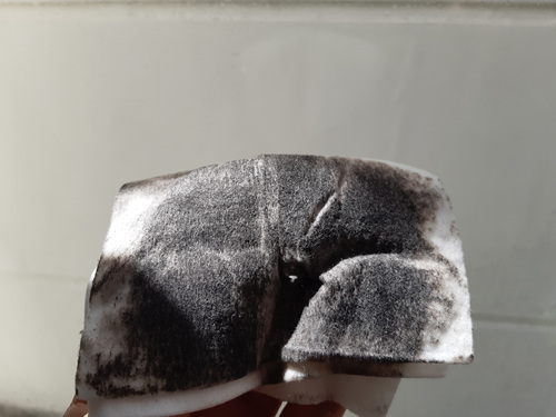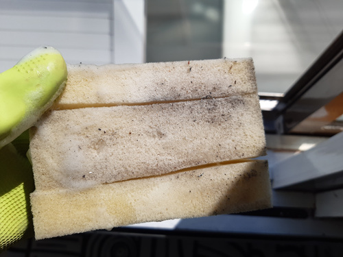스펀지는 청소 후 꼬질꼬질 상태.... 다른 창틀을 닦을때는 물에 헹궈서 다시 세제를 묻혀 닦으면 됩니다. 스펀지로 다 닦은 후에는 마른 걸레로 한 번 더 닦으면 끝..