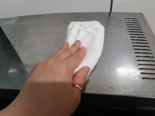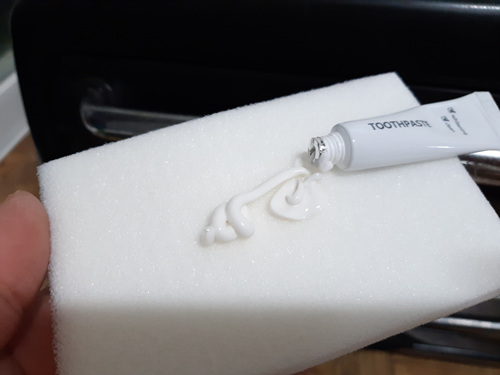 마른 행주에 치약을 묻혀 닦은 후 젖은 행주로 닦으면 깔끔한 상태가 됩니다.