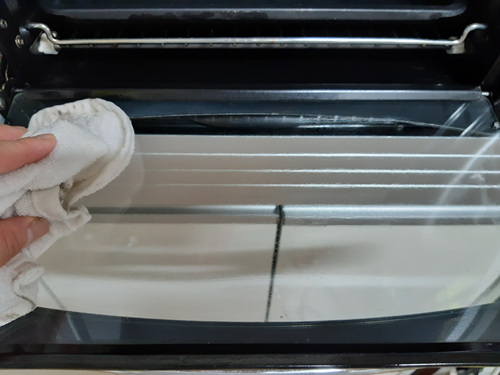 오븐 안쪽 유리에 음식물이 튄 자국들이 가득...이 부분도 치약으로 닦으면 간단히 지울 수 있습니다.