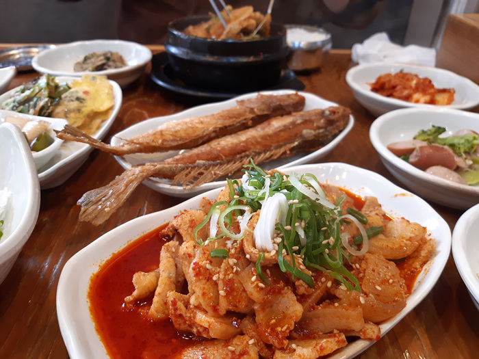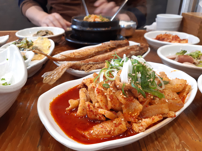 거기다 정식을 주문하면 제육볶음과 생선이 나옵니다. 생선은 1명이 오면 2마리... 2명이 오면 3마리가 나옵니다. 정식 가격에 비해 정말 잘 나오는 반찬들입니다.