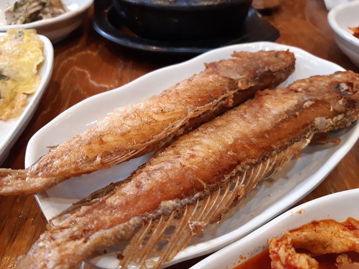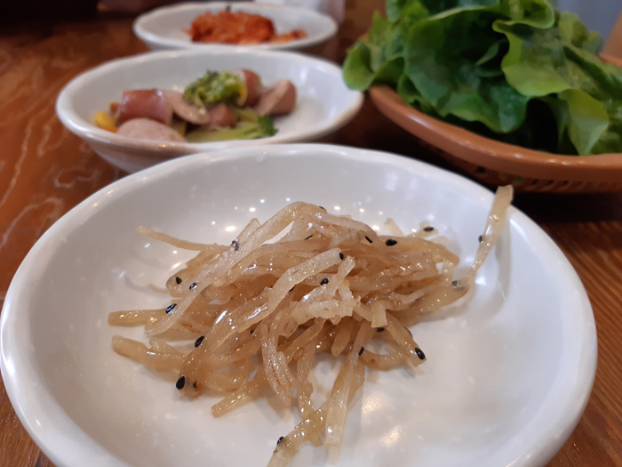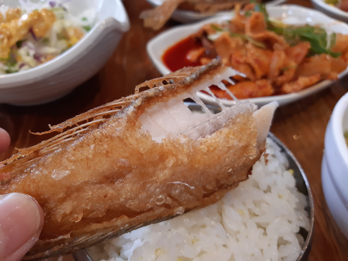 거기다 정식을 주문하면 제육볶음과 생선이 나옵니다. 생선은 1명이 오면 2마리... 2명이 오면 3마리가 나옵니다. 정식 가격에 비해 정말 잘 나오는 반찬들입니다.