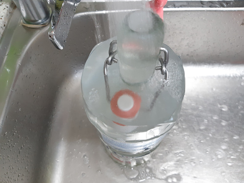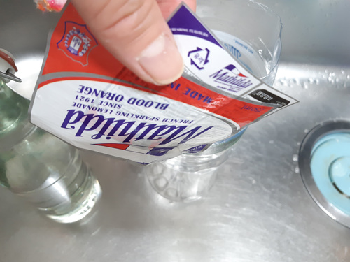 그리고 라벨이 붙은 병을 넣어 주면 되는데요. 병을 넣기 전에 페트병에 주방세제 한 방울 넣고 물을 가득 채워 주어야 합니다.
