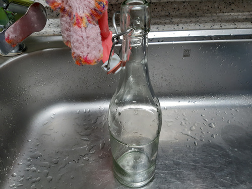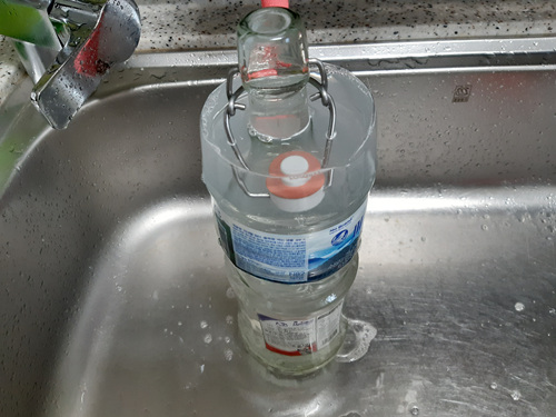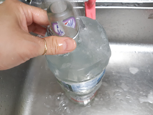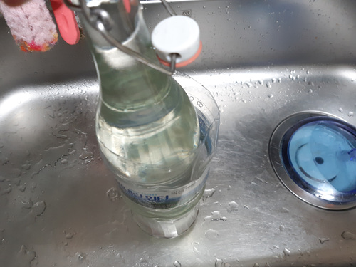 그리고 라벨이 붙은 병을 넣어 주면 되는데요. 병을 넣기 전에 페트병에 주방세제 한 방울 넣고 물을 가득 채워 주어야 합니다.